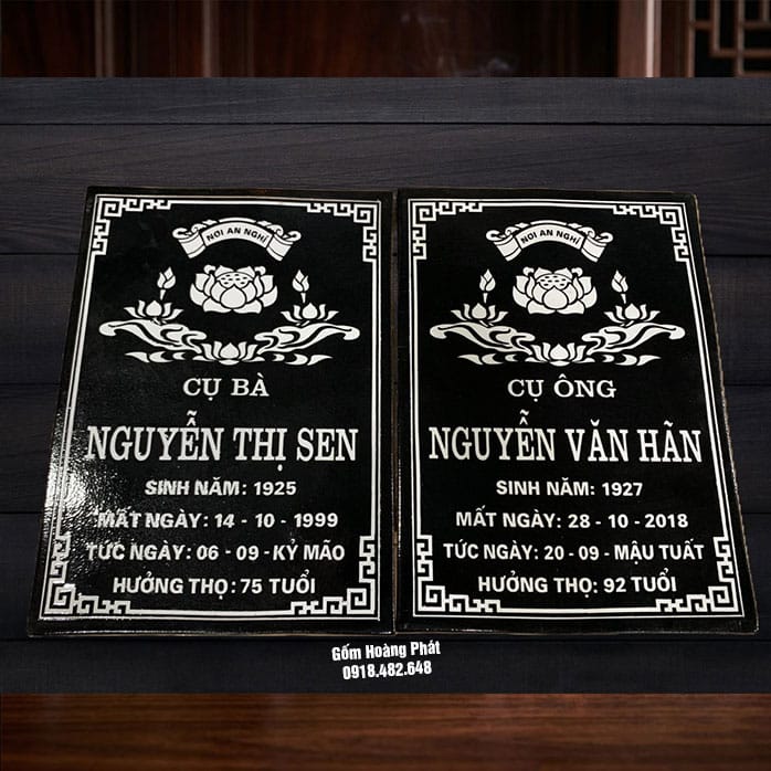 Bia mộ gốm Bát Tràng, nền đen, chữ trắng, không ảnh