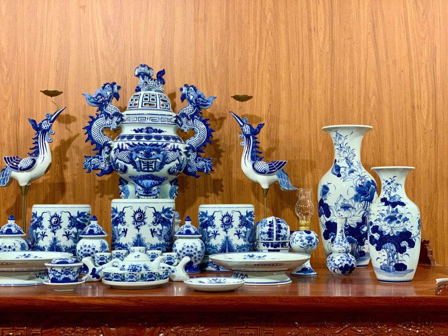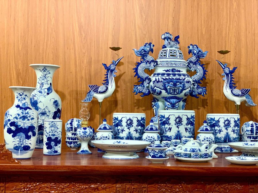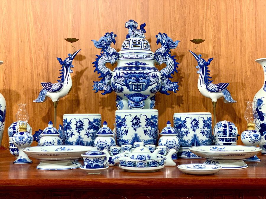 Bộ đồ thờ men lam Bát Tràng là dòng sản phẩm gốm sứ truyền thống nổi bật với sắc xanh lam đặc trưng, mang vẻ đẹp trang nghiêm và cổ kính cho không gian thờ cúng. Sản phẩm được chế tác thủ công từ gốm sứ cao cấp, họa tiết vẽ tay tinh xảo như rồng, phượng, hoa sen, chữ Phúc Lộc Thọ. Bộ đồ thờ không chỉ giúp bàn thờ thêm đồng bộ, sang trọng mà còn mang ý nghĩa phong thủy về bình an, tài lộc và sự hưng thịnh cho gia đình.