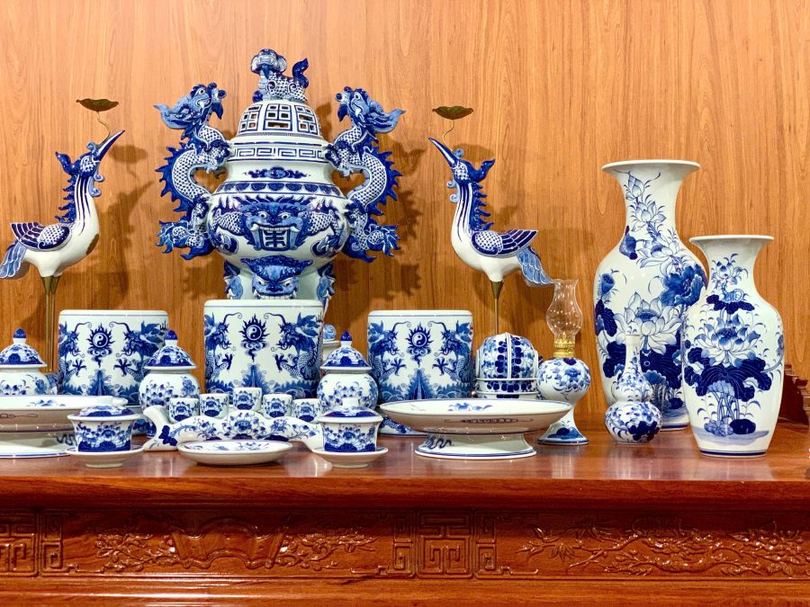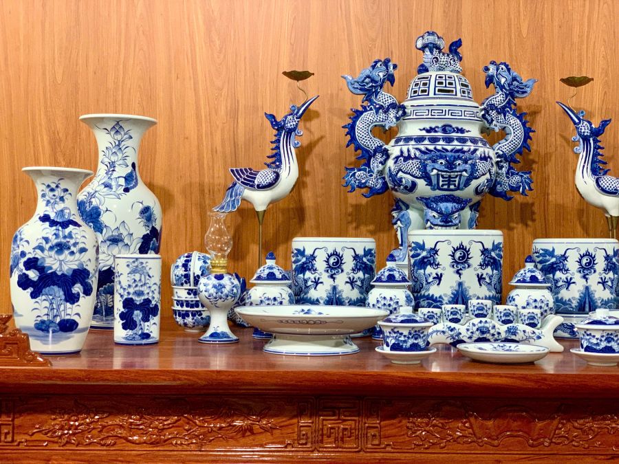 Bộ đồ thờ men lam Bát Tràng là dòng sản phẩm gốm sứ truyền thống nổi bật với sắc xanh lam đặc trưng, mang vẻ đẹp trang nghiêm và cổ kính cho không gian thờ cúng. Sản phẩm được chế tác thủ công từ gốm sứ cao cấp, họa tiết vẽ tay tinh xảo như rồng, phượng, hoa sen, chữ Phúc Lộc Thọ. Bộ đồ thờ không chỉ giúp bàn thờ thêm đồng bộ, sang trọng mà còn mang ý nghĩa phong thủy về bình an, tài lộc và sự hưng thịnh cho gia đình.