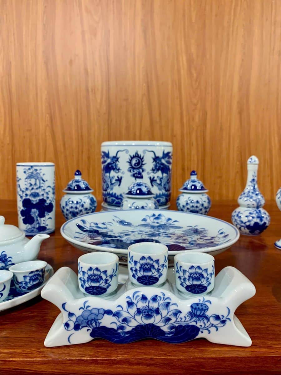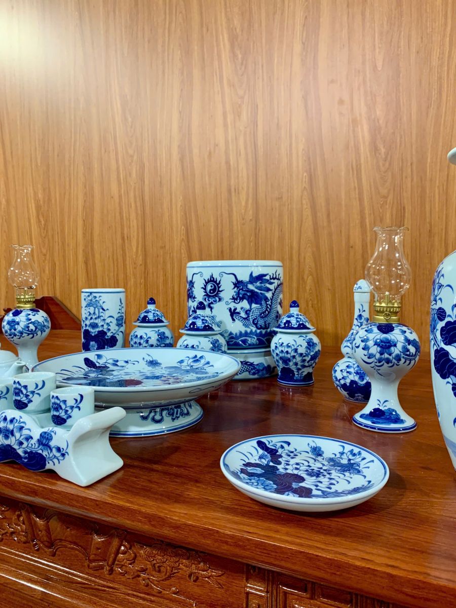 Bộ đồ thờ men lam Bát Tràng ban thần tài BTT01