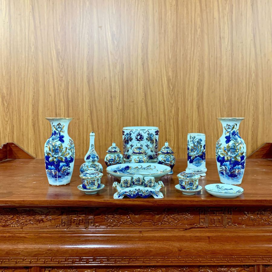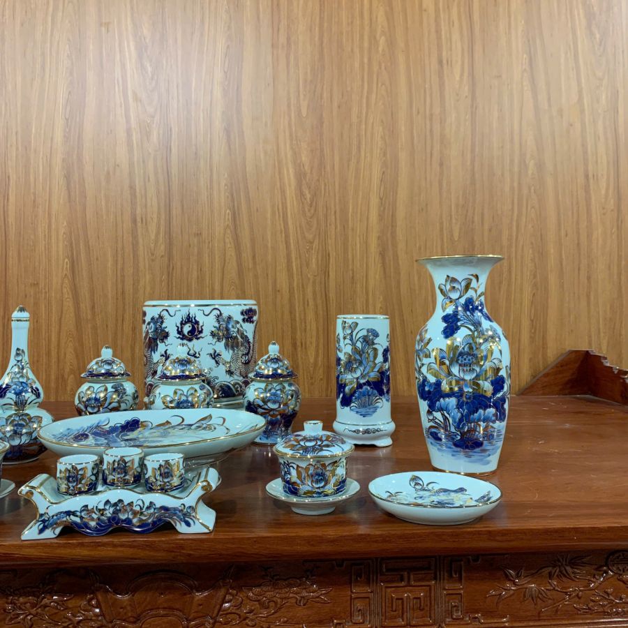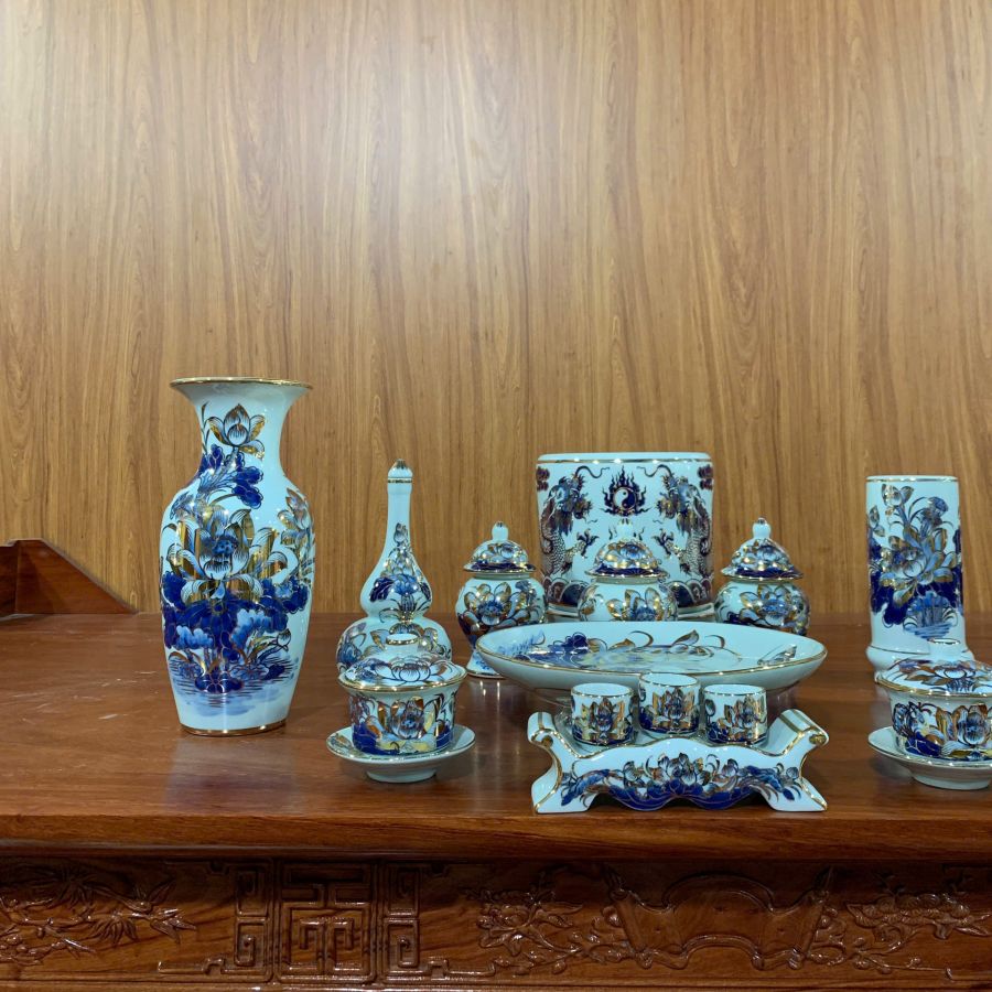 Bộ đồ thờ men lam vẽ vàng là dòng sản phẩm cao cấp được chế tác từ gốm sứ Bát Tràng, nổi bật với nền men lam xanh truyền thống kết hợp các chi tiết vẽ vàng sang trọng. Họa tiết rồng, phượng, hoa sen hay chữ Phúc Lộc Thọ được vẽ thủ công tinh xảo, tạo nên vẻ đẹp trang nghiêm và đẳng cấp cho không gian thờ cúng. Bộ đồ thờ không chỉ giúp bàn thờ thêm đồng bộ, nổi bật mà còn mang ý nghĩa phong thủy về tài lộc, bình an và sự hưng thịnh cho gia chủ.