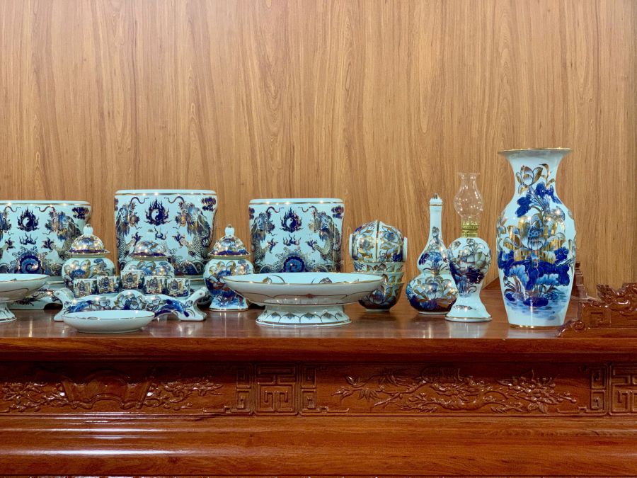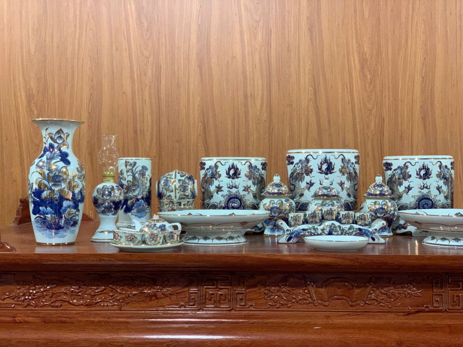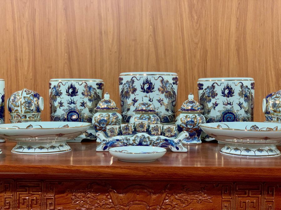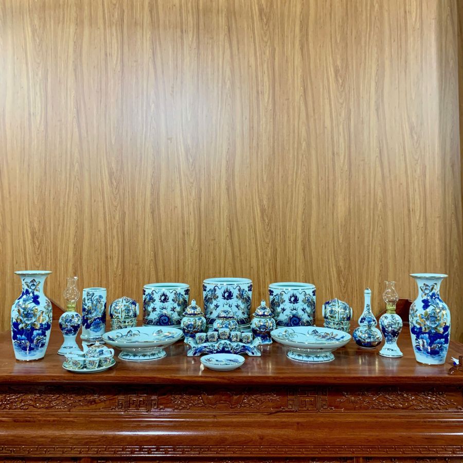 Bộ đồ thờ men lam vẽ vàng là dòng sản phẩm cao cấp được chế tác từ gốm sứ Bát Tràng, nổi bật với nền men lam xanh truyền thống kết hợp các chi tiết vẽ vàng sang trọng. Họa tiết rồng, phượng, hoa sen hay chữ Phúc Lộc Thọ được vẽ thủ công tinh xảo, tạo nên vẻ đẹp trang nghiêm và đẳng cấp cho không gian thờ cúng. Bộ đồ thờ không chỉ giúp bàn thờ thêm đồng bộ, nổi bật mà còn mang ý nghĩa phong thủy về tài lộc, bình an và sự hưng thịnh cho gia chủ.