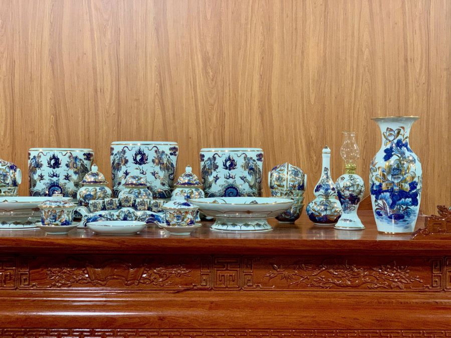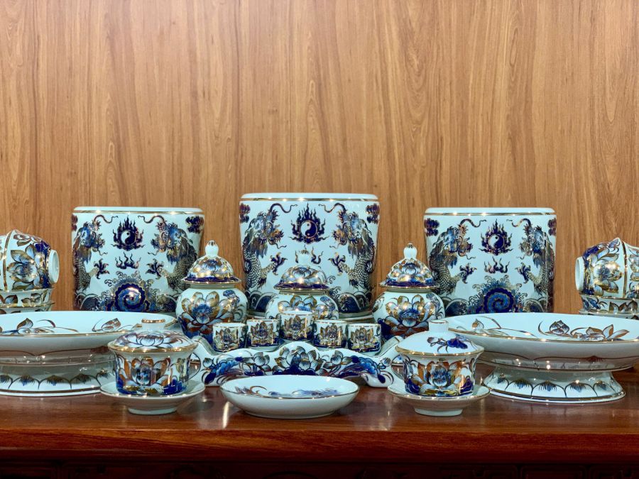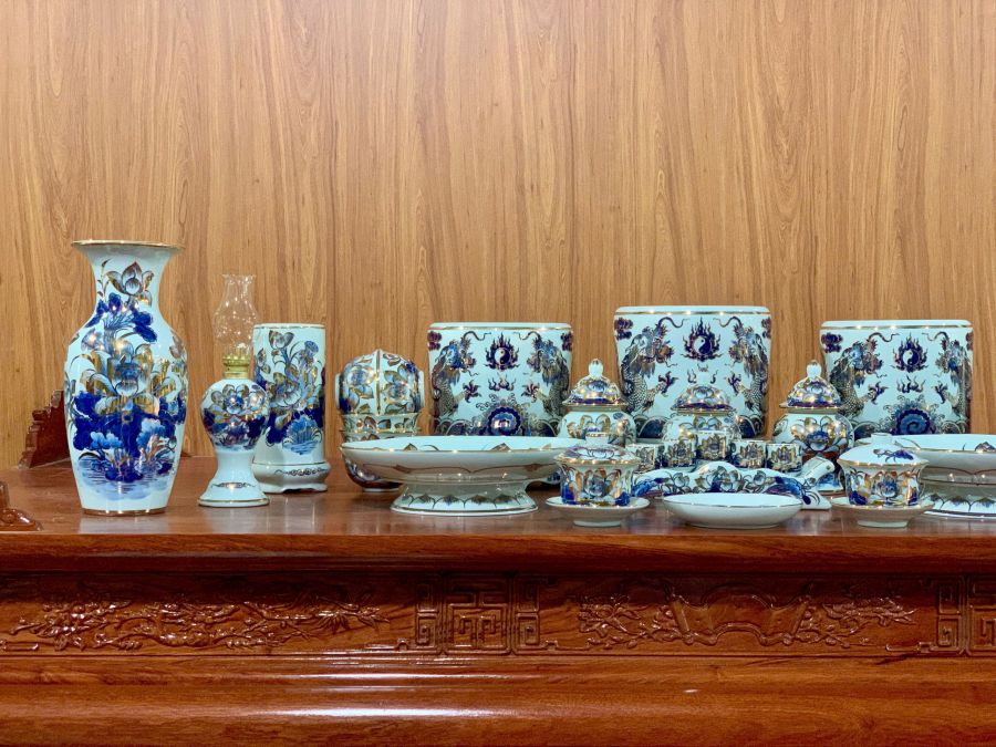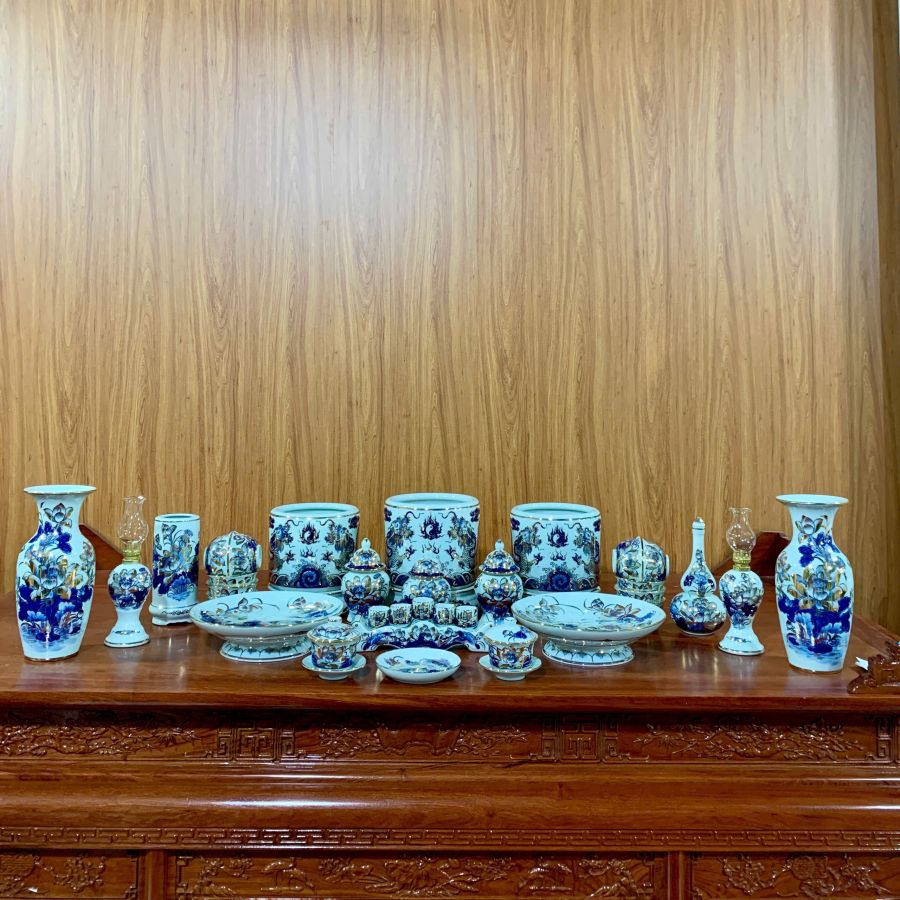 Bộ đồ thờ men lam vẽ vàng là dòng sản phẩm cao cấp được chế tác từ gốm sứ Bát Tràng, nổi bật với nền men lam xanh truyền thống kết hợp các chi tiết vẽ vàng sang trọng. Họa tiết rồng, phượng, hoa sen hay chữ Phúc Lộc Thọ được vẽ thủ công tinh xảo, tạo nên vẻ đẹp trang nghiêm và đẳng cấp cho không gian thờ cúng. Bộ đồ thờ không chỉ giúp bàn thờ thêm đồng bộ, nổi bật mà còn mang ý nghĩa phong thủy về tài lộc, bình an và sự hưng thịnh cho gia chủ.