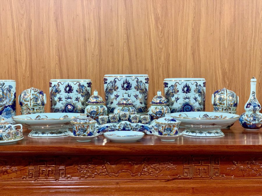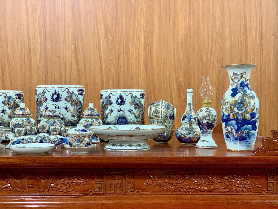 Bộ đồ thờ men lam vẽ vàng là dòng sản phẩm cao cấp được chế tác từ gốm sứ Bát Tràng, nổi bật với nền men lam xanh truyền thống kết hợp các chi tiết vẽ vàng sang trọng. Họa tiết rồng, phượng, hoa sen hay chữ Phúc Lộc Thọ được vẽ thủ công tinh xảo, tạo nên vẻ đẹp trang nghiêm và đẳng cấp cho không gian thờ cúng. Bộ đồ thờ không chỉ giúp bàn thờ thêm đồng bộ, nổi bật mà còn mang ý nghĩa phong thủy về tài lộc, bình an và sự hưng thịnh cho gia chủ.