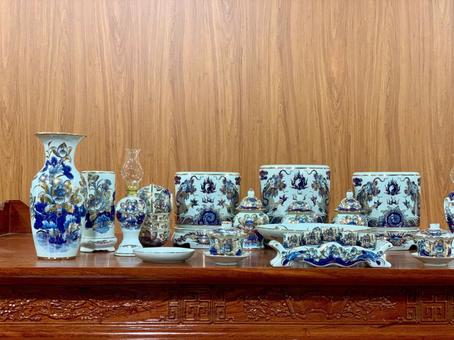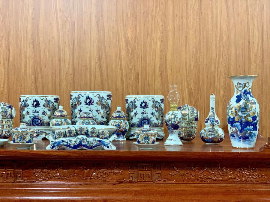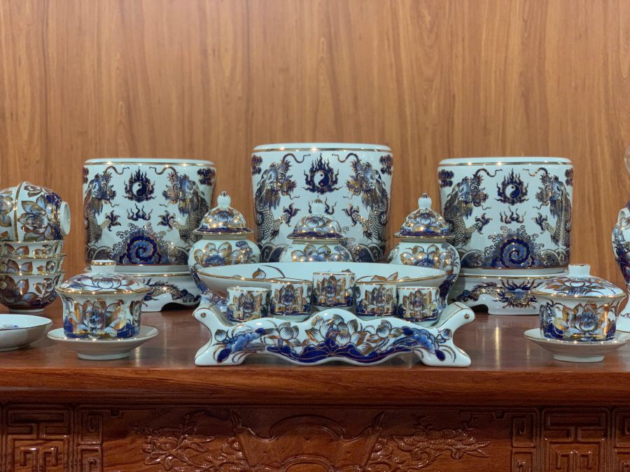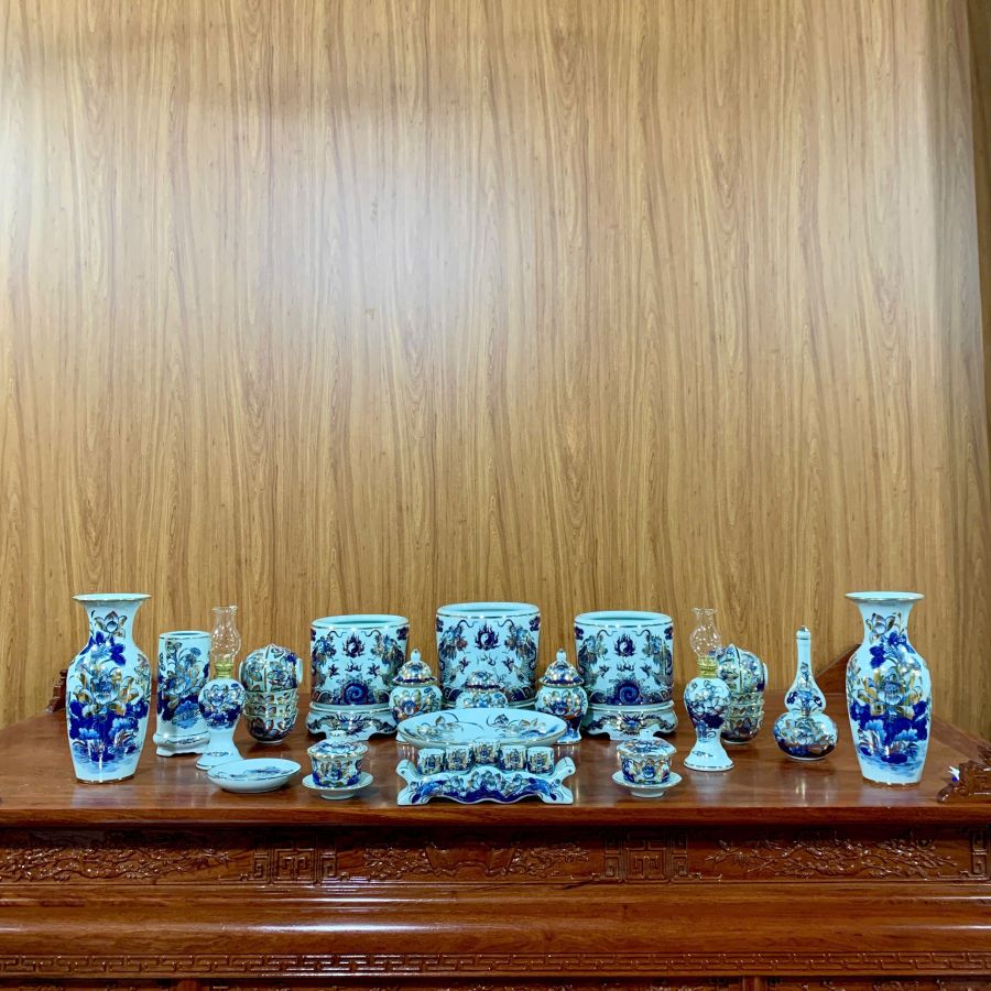 Bộ đồ thờ men lam vẽ vàng là dòng sản phẩm cao cấp được chế tác từ gốm sứ Bát Tràng, nổi bật với nền men lam xanh truyền thống kết hợp các chi tiết vẽ vàng sang trọng. Họa tiết rồng, phượng, hoa sen hay chữ Phúc Lộc Thọ được vẽ thủ công tinh xảo, tạo nên vẻ đẹp trang nghiêm và đẳng cấp cho không gian thờ cúng. Bộ đồ thờ không chỉ giúp bàn thờ thêm đồng bộ, nổi bật mà còn mang ý nghĩa phong thủy về tài lộc, bình an và sự hưng thịnh cho gia chủ.