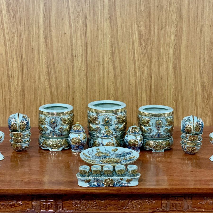 BỘ ĐỒ THỜ MEN RẠN ĐẮP NỔI VẼ VÀNG 01A