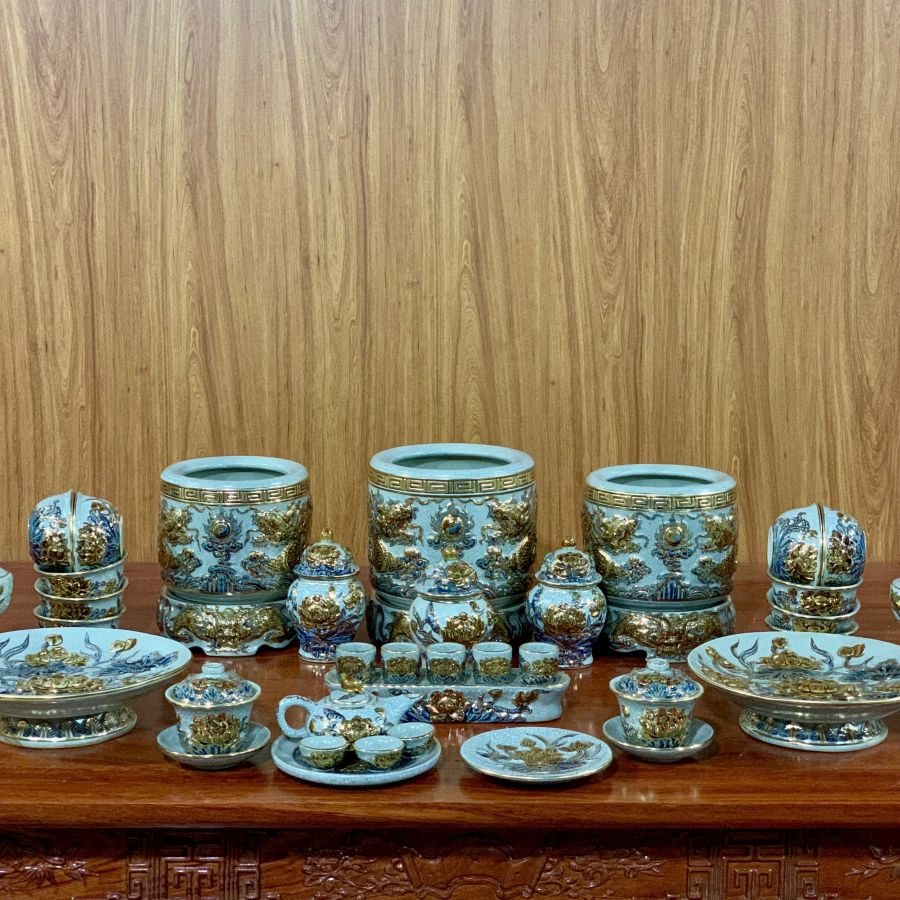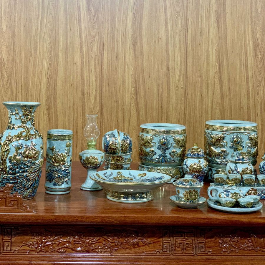 Bộ đồ thờ men rạn đắp nổi vẽ vàng là dòng sản phẩm cao cấp của gốm sứ Bát Tràng, nổi bật với lớp men rạn cổ kính kết hợp họa tiết đắp nổi tinh xảo và điểm vàng sang trọng. Các hoa văn rồng, phượng, hoa sen được chế tác thủ công tỉ mỉ, mang đến vẻ đẹp trang nghiêm và đẳng cấp cho không gian thờ cúng. Sản phẩm không chỉ giúp bàn thờ thêm đồng bộ, bề thế mà còn mang ý nghĩa phong thủy về tài lộc, bình an và sự hưng thịnh cho gia chủ.