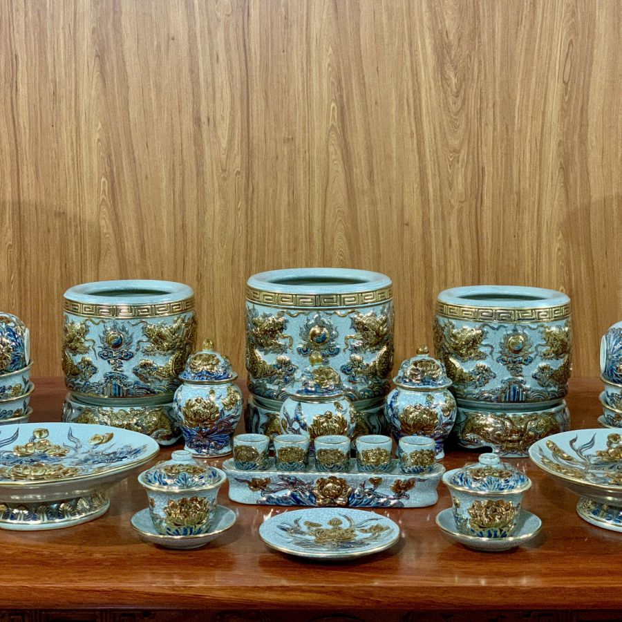 Bộ đồ thờ Rồng nổi 3D men lam