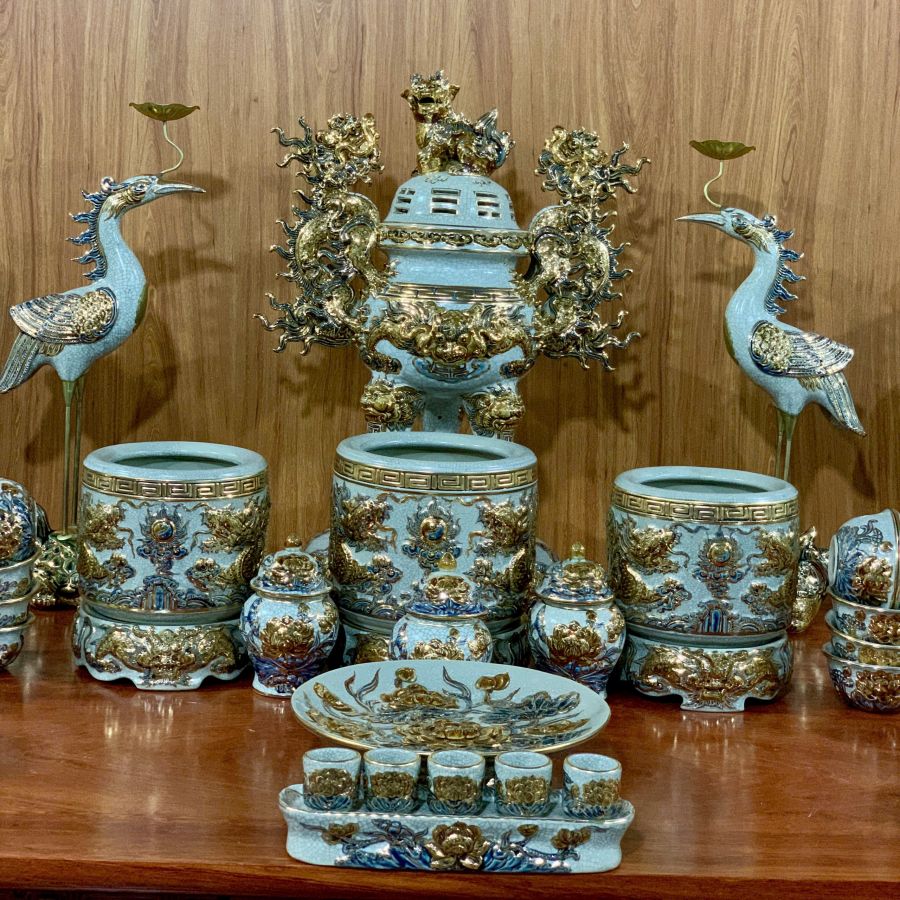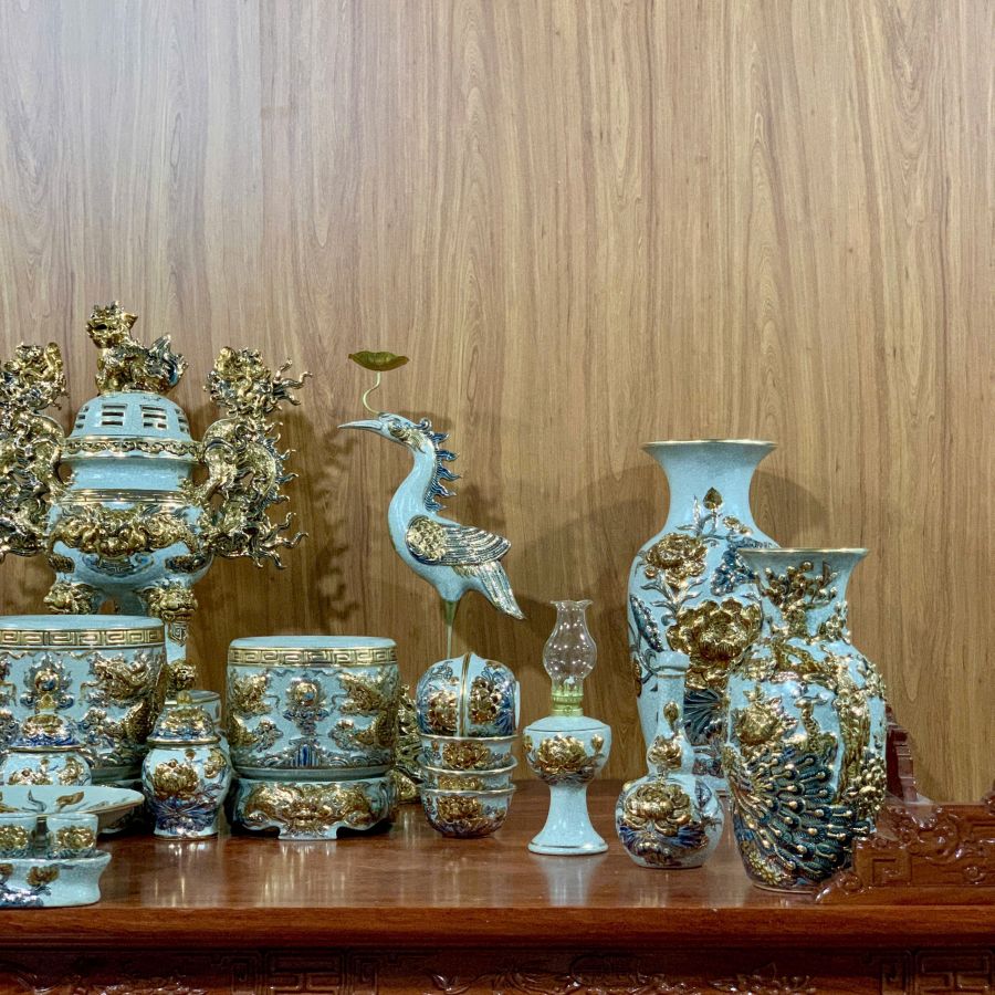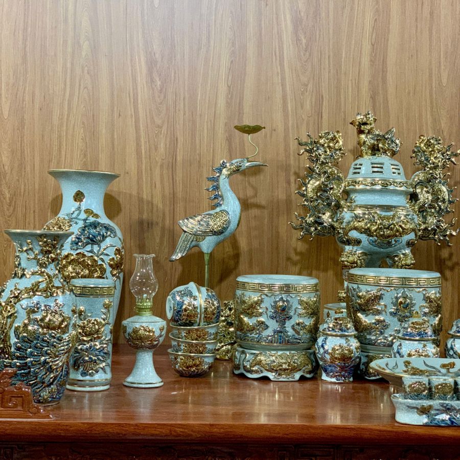 Bộ đồ thờ men rạn đắp nổi vẽ vàng là dòng sản phẩm cao cấp của gốm sứ Bát Tràng, nổi bật với lớp men rạn cổ kính kết hợp họa tiết đắp nổi tinh xảo và điểm vàng sang trọng. Các hoa văn rồng, phượng, hoa sen được chế tác thủ công tỉ mỉ, mang đến vẻ đẹp trang nghiêm và đẳng cấp cho không gian thờ cúng. Sản phẩm không chỉ giúp bàn thờ thêm đồng bộ, bề thế mà còn mang ý nghĩa phong thủy về tài lộc, bình an và sự hưng thịnh cho gia chủ.