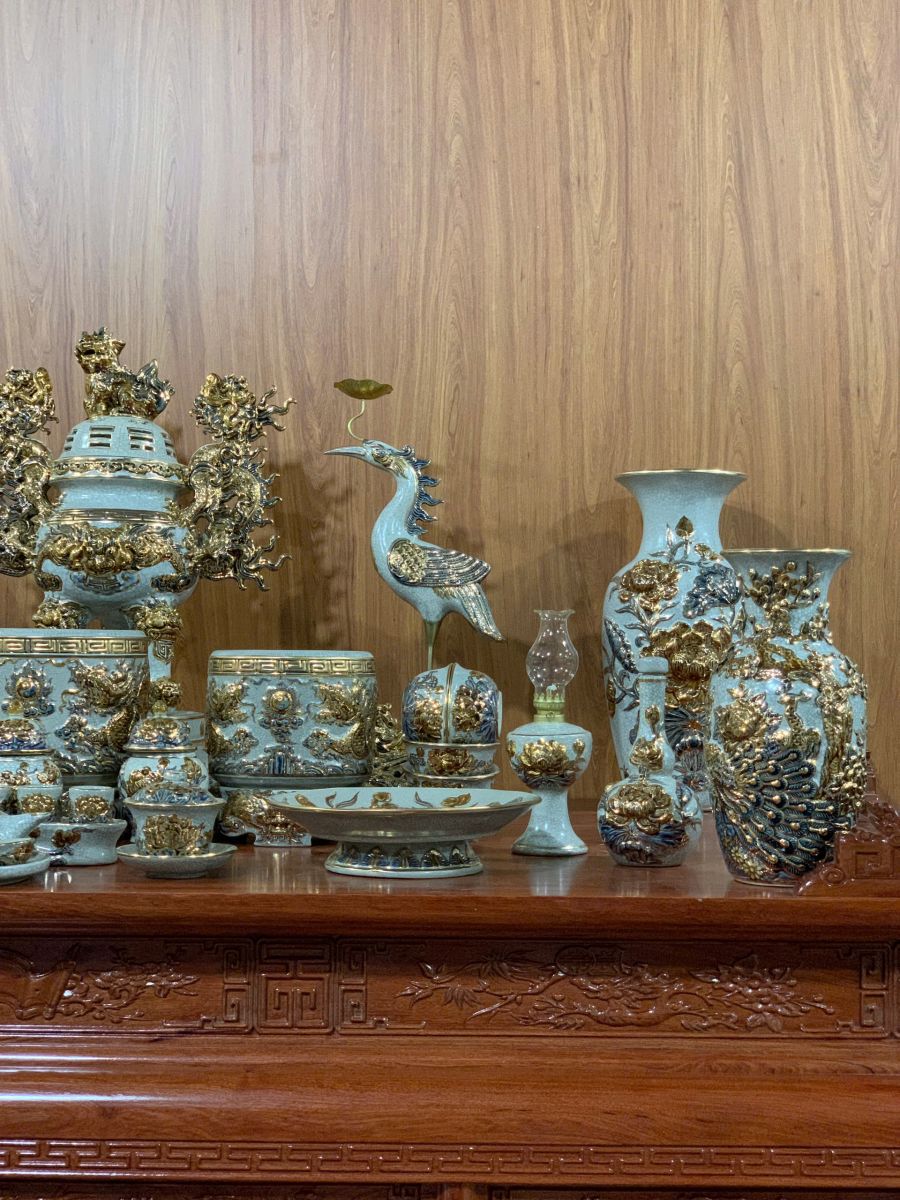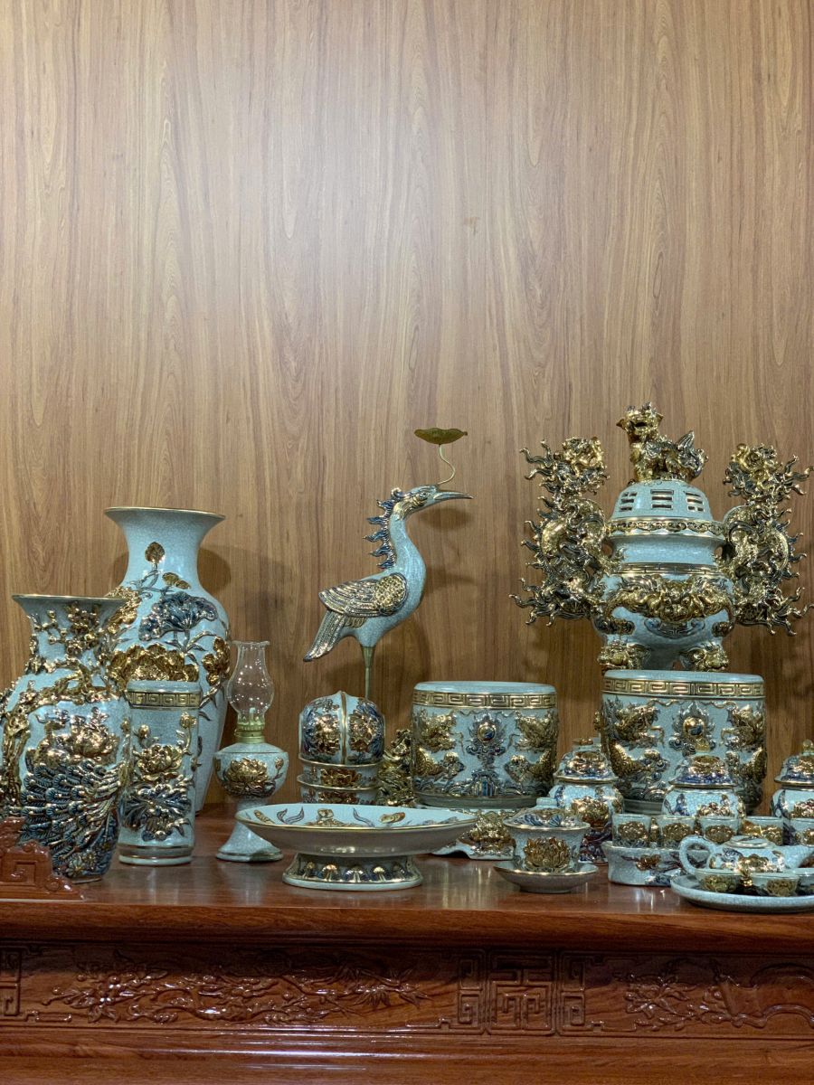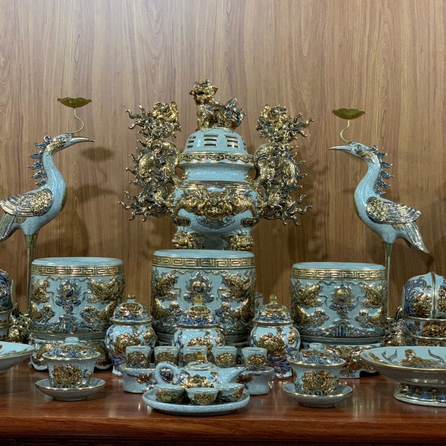 Bộ đồ thờ men rạn đắp nổi vẽ vàng là dòng sản phẩm cao cấp của gốm sứ Bát Tràng, nổi bật với lớp men rạn cổ kính kết hợp họa tiết đắp nổi tinh xảo và điểm vàng sang trọng. Các hoa văn rồng, phượng, hoa sen được chế tác thủ công tỉ mỉ, mang đến vẻ đẹp trang nghiêm và đẳng cấp cho không gian thờ cúng. Sản phẩm không chỉ giúp bàn thờ thêm đồng bộ, bề thế mà còn mang ý nghĩa phong thủy về tài lộc, bình an và sự hưng thịnh cho gia chủ.