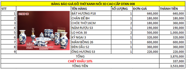 Bộ đồ thờ xanh nổi 3D cao cấp gốm sứ Bát Tràng DTXN022