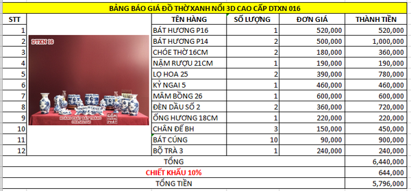 Bộ đồ thờ xanh nổi 3D cao cấp gốm sứ Bát Tràng DTXN022